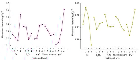 According to the R-value in Table 5, the main and secondary influencing factors of different fertilizers on Pb content in PLI roots were as follows: E (Pb2+) > A (N) > C (K2O) > B (P2O5) > D (sheep manure), and Pb2+ had the greatest influence on Pb content in PLI roots. It can be seen from the K value that the combination of factors that promote the maximum Pb content in PLI root is as follows: A4 B1 C4 D1 E4, namely N (0.45 g·kg−1), P2O5 (0 g·kg−1), K2O (0.45 g·kg−1), sheep manure (0 g·kg−1), Pb2+ (350 mg·kg−1); The level combination of factors to promote the minimum Pb content in PLI root was as follows: A3 B3 C1 D3 E1, namely N (0.3 g·kg−1), P2O5 (0.15 g·kg−1), K2O (0 g·kg−1), sheep manure (6 g·kg−1), Pb2+ (0 mg·kg−1).