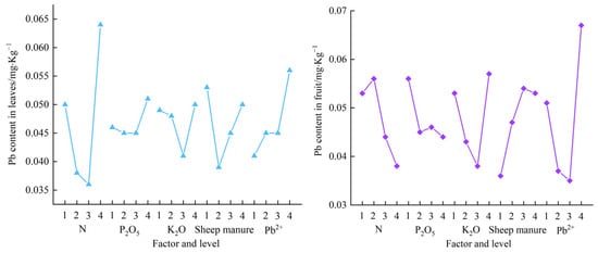 The main and secondary influencing factors on Pb content in PLI fruit were as follows: E (Pb2+) > C (K2O) > A (N) = D (sheep manure) > B (P2O5), and Pb2+ had the greatest influence on Pb content in PLI fruit. The combination of factors that promote the maximum Pb content of PLI fruit is as follows: A2 B1 C4 D3 E4, namely N (0.15 g·kg−1), P2O5 (0 g·kg−1), K2O (0.45 g·kg−1), sheep manure (6 g·kg−1), Pb2+ (350 mg·kg−1); The combination of factors that promote the minimum Pb content of PLI fruit is as follows: A4 B4 C3 D1 E3, namely N (0.45 g·kg−1), P2O5 (0.225 g·kg−1), K2O (0.3 g·kg−1), sheep manure (0 g·kg−1), Pb2+ (100 mg·kg−1).