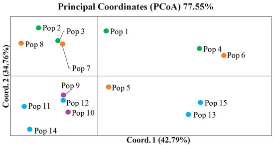 Principal coordinates analysis (PCoA) of 15 populations of Juniperus seravschanica from Central Asia based on pairwise population differentiation (PhiPT) values. Notes: Circles highlighted as green—Uzbekistan, orange—South Kyrgyzstan, purple—North Kyrgyzstan, blue—Kazakhstan.