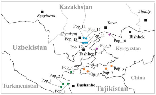 Location of sampled Juniperus seravschanica populations in Central Asia. Pop—population; enumeration according to Table 1. Notes: Circles highlighted as green—Uzbekistan, orange—South Kyrgyzstan, purple—North Kyrgyzstan, blue—Kazakhstan.