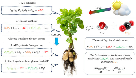 To determine the relationship between the number of starch monomer molecules and the number of CO2 molecules used in the synthesis of the former, it is necessary to consider the process of photosynthesis. Starch is synthesized by the plant as a result of the process of photosynthesis, which, in the case of potatoes, can be described in the form of four consecutive stages [30,31] (Figure 1).