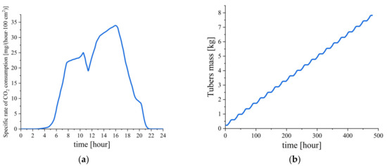 (a) The dependence of the specific (per unit area of leaves) rate of CO2 absorption by potato leaves according to [35]; (b) the calculated dependence of the tuber mass on the scale of the tuber formation period, calculated from experimental data from the urban vertical farm of the Federal Research Center “Fundamentals of Biotechnology” of the Russian Academy of Sciences and literature data on the dynamics of the specific rate of CO2 absorption by potato leaves depicted in Figure 2a.