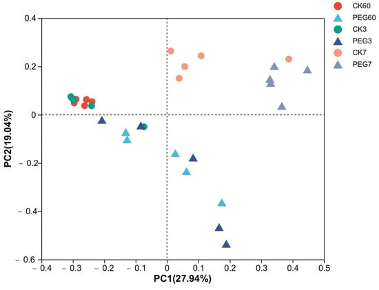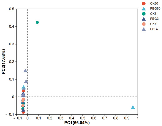 Principal coordinate analysis (PCoA) plot based on the weighted UniFrac distance for the bacterial community of sainfoin silage. CK60: sainfoin ensiling after 60 d. CK3: sainfoin silage after 3 d of aerobic exposure. CK7: sainfoin silage after 7 d of aerobic exposure. CK: control; PEG: polyethylene glycol (R2 = 0.0810, p = 0.0560).