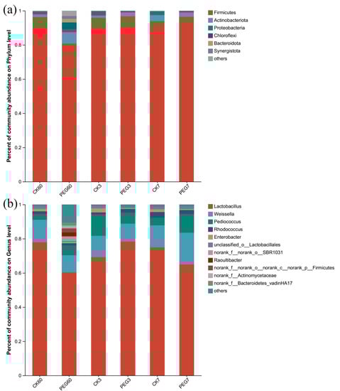 At the phylum level, as shown in Figure 2a, Firmicutes was dominant during 7 d of aerobic exposure, followed by Actinobacteria and Proteobacteria, with relative abundances of 80.81–96.73%, 1.28–6.60%, and 0.93–2.63%, respectively. There was no difference in the relative abundances of these bacteria between the control and the PEG-treated group after 60 d of ensilage and 7 d of aerobic exposure (p > 0.05). After 3 d of aerobic exposure, the relative abundance of Firmicutes in the PEG treatment was higher than that in the control (96.46 vs. 93.97%; p < 0.05), but the relative abundance of Proteobacteria was lower than that of the control (1.01 vs. 2.27%; p < 0.05).