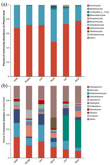 At the phylum level, as shown in Figure 4a, Ascomycota (relative abundance of 48.47–77.76%) was dominant in both the control and PEG-treated silage groups after 60 d of ensiling and during 7 d of aerobic exposure.