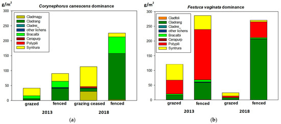 Estimates of specific cryptogamic biomass in the studied communities in 2013 and in 2018, respectively, from (a) Corynephorus canescens dominated site and (b) Festuca vaginata dominated site. Abbreviations of species names: Cladfoli—Cladonia foliacea, Cladmagy—C. magyarica, Cladrang—C. rangiformis, Cladrei_—C. rei, Bracalbi—Brachythecium albicans, Cerapurp—Ceratodon purpureus, Polypili—Polytrichum piliferum, Syntrura—Syntrichia ruralis.