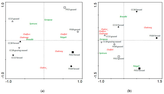 Species frequency (a) and biomass composition (b) of the studied sites, according to the principal component analysis (PCA). Explanation of symbols: empty up-triangle—CC13 grazed, filled up-triangle—CC13 fenced, empty down-triangle—CC18 grazed, filled down-triangle—CC18 grazing ceased, empty square—FV13 grazed, filled square—FV13 fenced, empty diamond—FV18 grazed, filled diamond—FV18 fenced. Scientific names are abbreviated to eight letters where the first four letters stand for the genus name while the last four ones for the species name, respectively. Bryophyte names are in green and lichen names are in red. Abbreviations of species names: Cladfoli—Cladonia foliacea, Cladfurc—C. furcata, Cladmagy—C. magyarica, Cladrang—C. rangiformis, Cladrei_—C. rei, Bracalbi—Brachythecium albicans, Cerapurp—Ceratodon purpureus, Polypili—Polytrichum piliferum, Syntrura—Syntrichia ruralis.