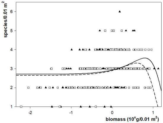 Distribution of species richness in the community as a function of the biomass of the samples taken from the Corynephorus canescens (filled up-triangle) and in the Festuca vaginata (empty square) dominated sites, respectively. The biomass scores are projected on a logarithmic scale while the species richness scores are shown on a linear scale. The used equation was a three parameter version of the Gaussian equation as f = a × exp(−0.5 × ((x − x0)/b)2), where x is the cryptogamic biomass (g) at 0.01 m2 and f is the species number of cryptogamic species at 0.01 m2, respectively, whereas a, b and x0 are parameters calculated via iterative parameter estimate functions. Solid line—curve calculated for Corynephorus canescens dominated site, dashed line—curve calculated for Festuca vaginata dominated site.