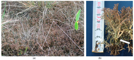 - Sinigla, M.; Szurdoki, E.; Lőkös, L.; Bartha, D.; Galambos, I.; Bidló, A.; Farkas, E. Distribution and Habitat Preference of Protected Reindeer Lichen Species ( Cladonia Arbuscula, C. Mitis and C. Rangiferina ) in the Balaton Uplands (Hungary). Lichenologist 2021, 53, 271–282. [Google Scholar] [CrossRef]
