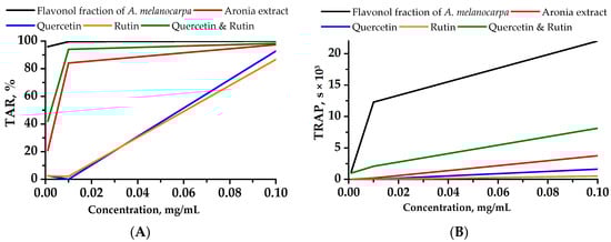 Chemiluminescent intensity attenuation (A) (TAR—total antioxidant reactivity) and time (B) (TRAP—total reactive antioxidant potential) vs. the concentration of the studied compounds. Values obtained from the quenching of luminol-enhanced chemiluminescence.