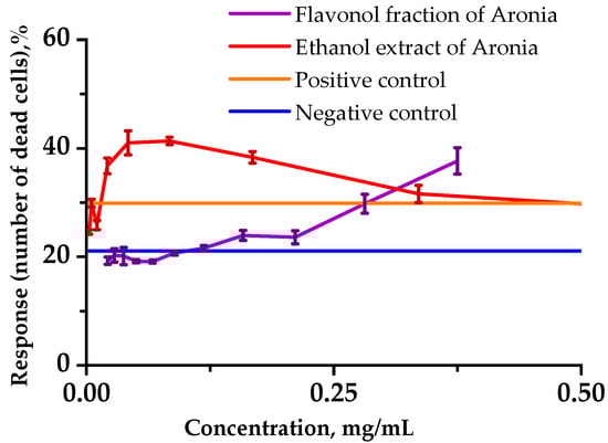 In order to assess the toxicity of the extract and black chokeberry flavonol extract, we investigated the cytotoxicity using a human lymphoblastic RPMI-1788 cell line (Figure 2).