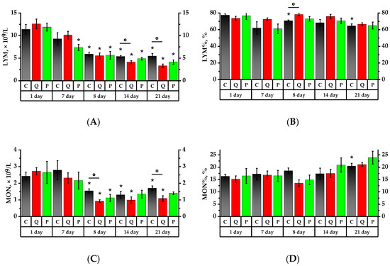 Monocyte count (MON) following CP administration decreased by 1.6 times in the Control Group, by 2.9 times in Group Q, and by 2.4 times in Group P compared to the values obtained on the 1st day (p < 0.05). On the 8th, 14th, and 21st days, the MON value in Group Q was 1.7 times lower than that of the Control Group (p < 0.05). On day 21, the monocyte ratio (MON%) increased significantly: 1.3 times in the Control Group, 1.4 times in Group Q, and 1.5 times in Group P compared to the values of day 1, while Group Q observed a decrease in MON that was 1.6 times lower than that for Group C (p < 0.05).