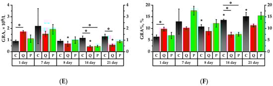 The PI of granulocytes increased by 3.2 times in the control group and 3.3 times in Group P subsequent to a 24-h exposure to the CP, in contrast to the results prior to the aforementioned exposure. One day after CP exposure, both groups, C and P, revealed, respectively, 3.2- and 3.3-time higher PI values of the granulocytes compared to the ones before CP administration. The MONO PI increased by 3.2 times in the control croup and 2.4 times in Group P (p < 0.05). The GRA PI increased by 1.3 times in Group Q in comparison to the 7th day. The MONO PI, on the other hand, decreased by 2.5 times and was 3.4 times lower than the control group’s of the same day (p < 0.05). Regarding the results of the 7th day, the PN of granulocytes and monocytes, similar to PI, increased in the control group by 2.2 and 2.8 times, and in Group P by 2.75 and 2.6 times, respectively (p < 0.05). In Group Q, the PN of granulocytes and monocytes decreased by 1.6 and 4.4 times compared to day 7, respectively (p < 0.05).