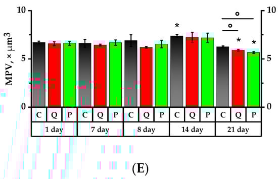 The mean platelet volume (MPV) of rats administered quercetin and rutin after one-day exposure to the CP decreased in relation to the 7th day and was 1.1 lower than that of the control group (p < 0.05). On the 14th day, MPV in Group Q increased by 1.1 times over the 8th day, whereas the MPV Control Group was 1.1 times higher than on the 1st day of the study (p < 0.05).