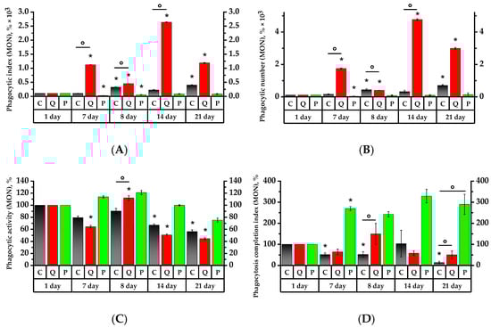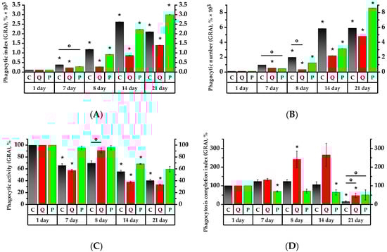 The 7th day revealed a 1.5-fold decrease in the phagocytic activity (PA) of granulocytes in the Control Group, while the PA of granulocytes and monocytes was 1.75 and 1.6 times lower in Group Q compared to the 1st day of the study, respectively. As for Group P, its PA of granulocytes and monocytes was, respectively, 1.4 and 1.3-fold lower than that of the control group on the 1st day of study (p < 0.05).
