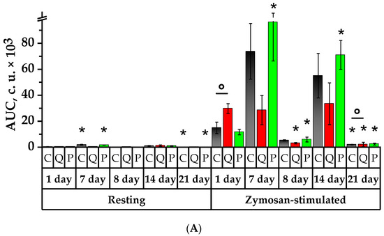 The neutrophils’ response to the CL reaction induced by zymosan was observed to be accompanied by a significant increase in Imax and AUC parameters in Group P, resulting in a 10.3 and 8.2 times increase, respectively, which was significantly higher than that of the Control Group. Compared to the 1st day, the kinetic rate of the zymosan-induced reaction grew spontaneously in Groups C and P. The time showing the induced CL peak of Group Q decreased by 1.2 times in comparison to the values recorded on the 1st day for the control group, and it was significantly lower in Groups Q and P with respect to the values of the 1st day in the Control Group.