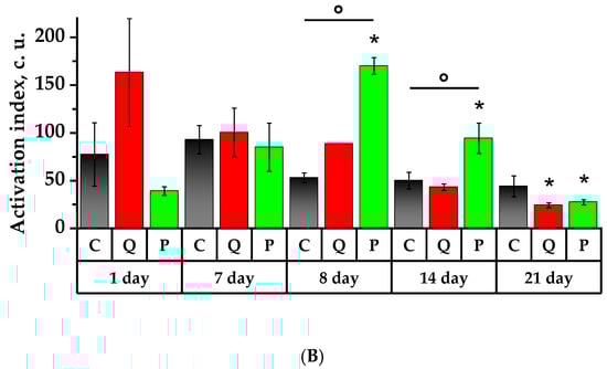 As for the number of activated granulocytes and monocytes in Groups C and P, their PA remained below that of the control group on the 1st day. Compared to day 7, the PA of Group Q increased by 1.6 and 1.7 times, respectively, and was reliably higher than the PA of granulocytes and monocytes of the control group of the same day by 1.5 times (p < 0.05).