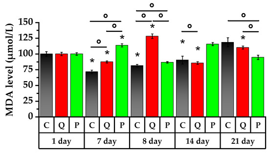 Over the course of the subsequent 7 days, both the control group and the group of rats receiving the Aronia flavonol fraction experienced an increase in their MDA levels of 11% and 33%, respectively. The MDA level in Group Q experienced a decrease of 33% (p < 0.05).