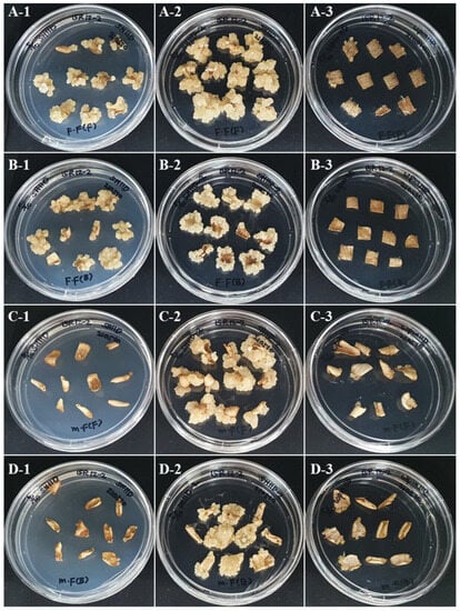 A comparison of callus induction rates according to medium composition showed that SH11DP was the most effective. The callus was slightly yellow, friable, had high water content, and grew rapidly (Figure 1A–D-2). By contrast, in the WPM11D medium, a small amount of callus was induced, but most of the sections were browned (Figure 1A–D-3). Beruto et al. [24] reported that the physicochemical characteristics of callus may vary depending on the type of gelling agent, which affects the differences in water and nutrients available to the explant. In this study, we found that the callus formation rate was higher in the SH11DP medium than in the SH11D medium. This is thought to be because phytagel absorbs water and nutrients more easily than agar. In addition, agar is composed of two polysaccharides, agarose and agaropectin, whereas phytagel is composed of only one water-soluble anionic polysaccharide, which is thought to cause a difference in the callus formation rate depending on its composition [25].