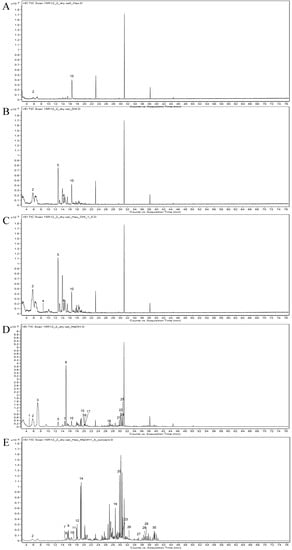 Figure 2. Component analysis of petal-derived callus extracts by gas chromatography–mass spectrometry. The extraction solvents used were hexane (A), dichloromethane (B), hexane:dichloromethane (1:5) (C), methanol (D), and hexane:methanol (1:5) (E).