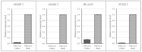 To compare the expression levels of genes involved in the biosynthesis of VOCs, RNA was extracted from petals and petal-derived callus of rose, and qRT-PCR was performed targeting OOMT1, OOMT2, RhAAT1, and NUDX1. As a result, it was found that the expression level was lower in the callus than in the petals as a whole, and among them, the expression level of RhAAT1 was relatively higher than that of other genes in petal-derived callus (Figure 3).