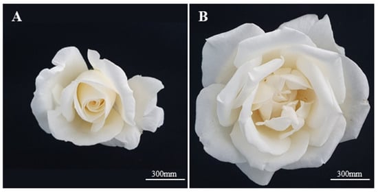Figure 4. The flowers of the rose breeding line 15R-12-2 were used in this study. (A) Partially open flower (POF); (B) fully open flower (FOF).