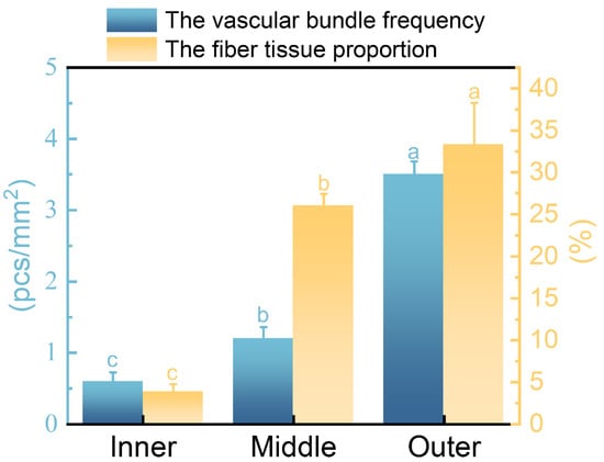 The frequency of vascular bundle and the tissue proportion of fiber. Different letters indicate significant differences among different radial regions (p < 0.05).