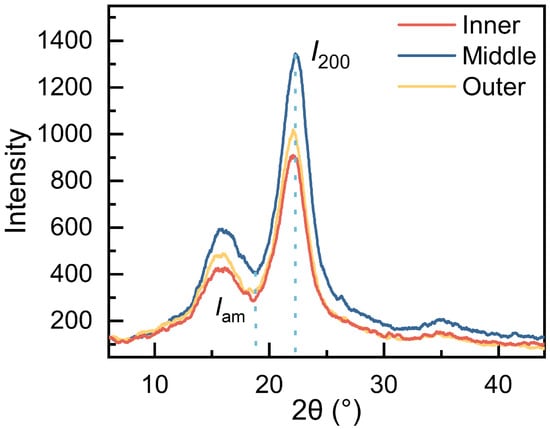 The mechanical properties of fibers are influenced by factors such as their crystallinity and MFA [49]. The CrI was derived from the data obtained by calculation(Figure 6). The cellulose crystallinity of the fibers in the inner, middle, and outer regions was , , and , respectively (Figure 7). While the cellulose crystallinity of the middle fibers exhibited the highest value, the difference between inner and outer fibers was found to be negligible. One-way ANOVA analysis showed that there was no significant difference in the cellulose crystallinity of the fibers along the radial direction. The fibers from O. abyssinica demonstrated a higher degree of crystallinity compared to Phyllostachys edulis and Dendrocalamus farinosus. As cellulose crystallinity is known to reflect the physical properties of bamboo fibers to a certain extent [50], suggesting that O. abyssinica may possess superior mechanical properties.