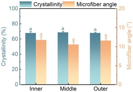 The cellulose crystallinity and MFA of fibers in O. abyssinica. Different letters indicate significant differences among different radial regions (p < 0.05).