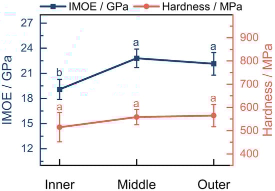 Indentation modulus of elasticity and hardness of cell walls of fibers in O. abyssinica. Different letters indicate significant differences among different radial regions (p < 0.05).