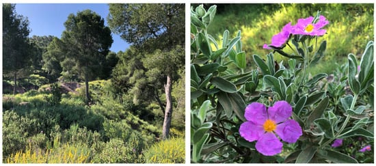 Cistus albidus is one of the approximately 20 species of the Cistus genus [1]. The genus’ name is derived from the ancient Greek term kistos [2]. It is supposed that the name alludes to the woody capsule fruits. Evergreen in its Mediterranean homeland and between 50 and 250 centimeters tall [3], this shrub is called albidus, not because of the colour of its flowers, but because its leaves are finely covered with white hair (trichomes) [4]. For its optimal development, it needs calcareous, sandy, or siliceous soils, as found in the garrigue of the Mediterranean [5,6]. Here, it can grow in large groups (known as jarales in Spanish) (Figure 1) and sometimes invade adjoining areas. It does not make high demands on the soil in terms of nutrients [6], but it needs permeability as it does not tolerate stagnant soils.