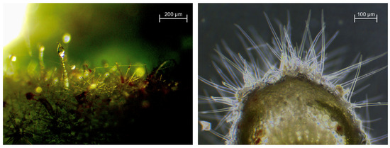 Trichomes: Glandular trichomes with secretion of bioactive compounds on their tops (left). Stellar trichomes covering the central vein of a leave (right). Images were captured by the authors using a Swift microscope, model SW380T-SC500-5PBC (M TEC USA Inc., Tschertz, TX, USA).