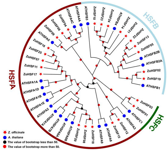 In order to examine the categorization of ZoHSF genes, we generated a phylogenetic tree that included A. thaliana with 21 HSF genes and ginger with 25 HSF genes. Utilizing distinctions observed within the HR-A/B domain and phylogenetic connections within the ZoHSF genes, we classified the ZoHSF members into three major groups: HSFA, HSFB, and HSFC (Figure 2). Out of the three groups, group A consisted of the highest number of ZoHSF members (13), followed by group B (10), with group C exhibiting the fewest members (2).