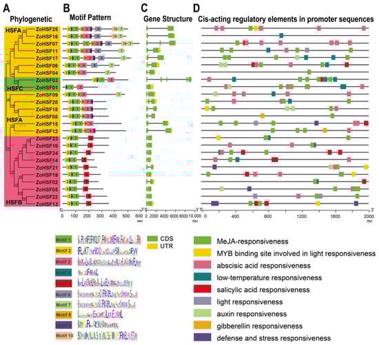 Phylogenetic relationships, gene structures, architecture of the conserved protein motifs, and the cis-acting elements analysis of the ZoHSFs. (A) The phylogenetic tree was constructed based on the full-length sequences of ginger HSF proteins, including HSFA, HSFB, and HSFC. (B) Motif patterns of ZoHsf genes. Motifs numbered 1 to 10 are visually represented by distinct colored boxes. The detailed sequence information for each motif can be found in additional file 1 (Table S1 and Table S2). (C) Exon–intron structures of ZoHSF genes. (D) The cis-acting elements of the ZoHSF promoter region, and different color blocks represent different elements.