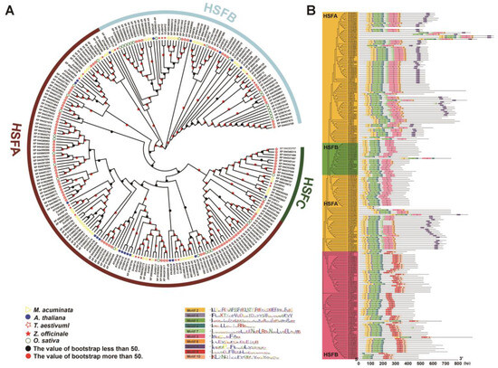 Monocotyledonous plants include Oryza sativa, Musa acuminata, Zingiber officinale, and Triticum aestivum, whereas Arabidopsis belongs to the dicotyledonous category. Analysis of the phylogenetic tree indicated that most subgroups of ZoHSF contained both monocotyledonous and dicotyledonous representatives (Figure 4). This suggests that HSF genes emerged in both types of plants prior to their differentiation [51]. Additionally, a conserved motif analysis revealed that genes within the same group in ginger shared similar sequence structures. For example, HSFA exclusively possessed motif 8 and motif 9, whereas HSFB contained motif 5; motif 3 was present in both HSFA and HSFB. Moreover, motif 1 and motif 4 were found in all HSF proteins across different groups. This specific arrangement of motifs likely contributes to the distinct functionalities exhibited by each group [52]. Similar findings have been reported in HSF members of other plants, such as Phyllostachys edulis [53], Cucurbita moschata [54], and Camellia sinensis [55].