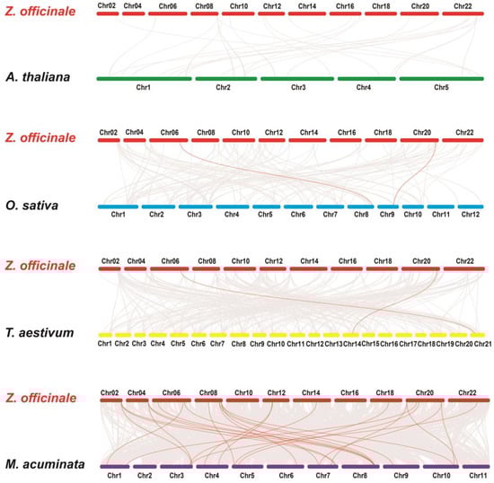 To investigate the phylogenetic relationship of ZoHSFs in ginger, we compared them with those from four other species: O. sativa, M. acuminata, Arabidopsis, and T. aestivum. The results, shown in Figure 5, indicate collinear relationships between ginger and these species. Gray lines represent all genes with collinear relationships, while red lines represent HSF genes. Among the analyzed species, ginger exhibited syntenic relationships with 17 ZoHSF genes in banana, followed by rice (2), wheat (2), and Arabidopsis (0). The number of collinear gene pairs between ZoHSFs and banana, rice, wheat, and Arabidopsis were identified as 26, 2, 2, and 0, respectively. Notably, two ZoHSF genes (ZoHSF01 and ZoHSF23) in ginger showed collinearity with HSF genes in three species: O. sativa, M. acuminata, and T. aestivum. This suggests that these two ZoHSF genes may have existed prior to the differentiation of these species.