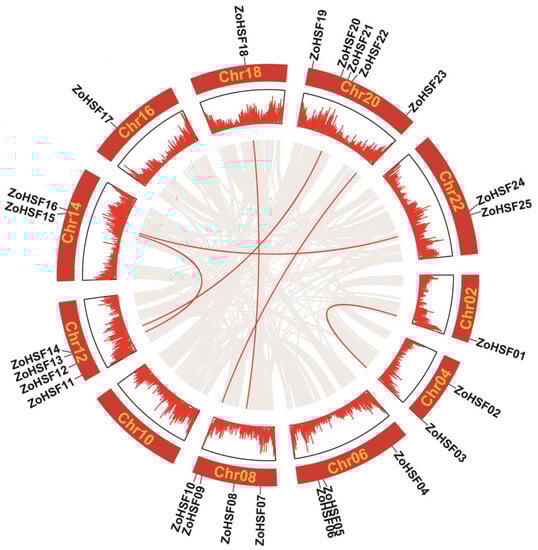 Schematic presentations of the inter-chromosomal relationships of ginger HSF genes. The red lines indicate duplicated HSF gene pairs in ginger. The chromosome number is indicated in the middle of each chromosome.