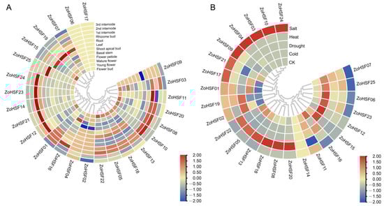 To explore the potential functions of the ZoHSF genes in different developmental stages of ginger organs/tissues and various abiotic stresses, we used RNA-seq data to detect their expression patterns. In different plant tissues, the expression of ZoHSF family members is significantly different (Figure 7A). Most genes were detected in the all kinds of tissues, such as ZoHSF02, ZoHSF05, and ZoHSF18, while some genes were not detected in these three tissues, such as ZoHSF06 and ZoHSF17. The genes that are not expressed in all tissues may be a pseudogene or have a special temporal or spatial expression pattern that is not detected in our data. Further studies showed that the expression patterns of individual ZoHSF genes were tissue-specific. For example, ZoHSF07, ZoHSF19, and ZoHSF15 were only highly expressed in ginger leaves; ZoHSF21 and ZoHSF12 were only expressed in ginger stems; and ZoHSF25 was only highly expressed in ginger roots. The expression of some genes showed significant trends at different developmental stages. For example, the expression level of ZoHSF18, ZoHSF05, ZoHSF22, and ZoHSF13 decreased first and then increased with flower development, while the expression level of ZoHSF21 and ZoHSF07 increased first and then decreased with flower development (Figure 7A).