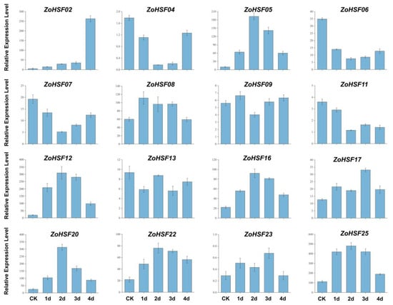 To investigate the potential functions of the ZoHSF genes under various abiotic stresses, we used RNA-seq data to detect their expression levels under cold, heat, drought, and salt treatments; ZoHSF14 were not expressed in any of the four treatments. The other 24 ZoHSF genes were induced by at least one stress treatment. Among of them, the expression of 9 genes was induced by cold, that of 11 genes by heat, that of 7 genes by drought, and that of 16 genes by salt (Figure 7B). Therefore, the greatest number of these genes was induced by salt and the lowest by drought.