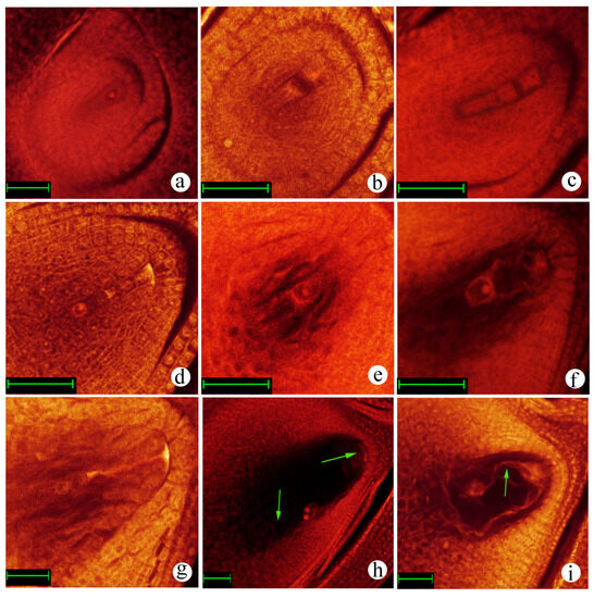 Embryo sac development of the interspecific hybrid. (a) Megasporocyte stage; (b) meiotic division stage, dyad stage; (c) meiotic division stage, tetrad stage; (d) functional megaspore stage; (e) mono-nucleate embryo sac stage; (f) two-nucleate embryo sac stage; (g) meiotic division stage, tetrad stage, abnormal degradation of megaspore cell; (h) mature embryo sac stage (the arrows indicate female germ unit and polar nuclei degradation); (i) mature embryo sac stage (the arrow indicates no female germ unit). Bar = 40 μm.