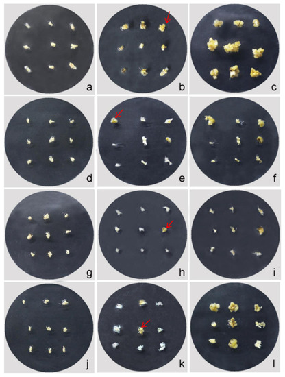 Callus induction of the interspecific hybrid in different media. (a–c) Callus. Induction in the Y1 medium at 0 d, 10 d, and 30 d, respectively. (d–f) Callus induction in the Y2 medium at 0 d, 10 d, and 30 d, respectively. (g–i) Callus induction in the Y3 medium at 0 d, 10 d and 30 d, respectively. (j–l) Callus induction in the Y4 medium at 0 d, 10 d and 30 d, respectively. The red arrow indicates the initiation of differentiation.
