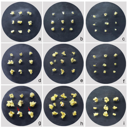 Effect of different BA concentrations on the callus proliferation of the interspecific hybrid. (a,d,g) Callus was sub-cultured in the J1 medium for 2 d, 10 d, and 25 d, respectively. (b,e,h) Callus was sub-cultured in the J2 medium for 2 d, 10 d, and 25 d, respectively. (c,f,i) Callus was sub-cultured in the J3 medium for 2 d, 10 d, and 25 d, respectively. The arrow indicates embryogenic degeneration of the callus with white color.