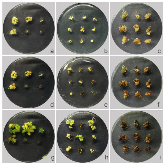 Callus status after co-culturing with different colchicine concentrations. (a,d,g) Callus was co-cultured with 400 mg·L−1 colchicine for 3 days and differentiated for 2 d, 10 d, and 20 d, respectively. (b,e,h) Callus was co-cultured with 500 mg·L−1 colchicine for 3 days and differentiated for 2 d, 10 d, and 20 d, respectively. (c,f,i) Callus was co-cultured with 600 mg·L−1 colchicine for 3 days and differentiated for 2 d, 10 d, and 20 d, respectively.