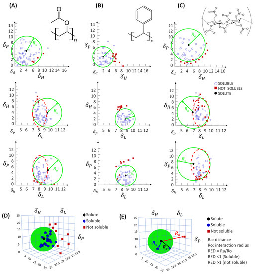 (A–C) Two- and (D,E) three-dimensional plots , , and of solute solubility sphere of Hansen (green circle) with its interaction radius (), solute–solvent distance (; Equation (8)), and their relative energy distances (RED; Equation (9)) [3,28].