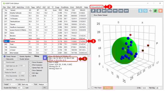 HSPiP in its 5.4 edition presents HSP information (1) about the target analyte: lactic acid polymer (2). In the 3D graph, the analyte’s green solubility sphere with the interaction radius is superimposed on the blue spheres (compatible solvents, RED < 1), and the red squares are located outside the sphere (incompatible solvents). A list of solvents and their RED values are provided with a highlight (3) for pyridine due to its lower RED value [2].