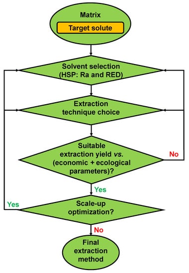 Other predictive tools have been developed and used as alternatives to HSPs, including Abraham solvation parameters [44], the conductor-like screening model for real solvents (COSMO-RS), linear solvation energy relationships introduced by Kamlet, Abboud, and Taft (KAT-LSER) [45], the extended Hildebrand solubility approach (EHSA) [46,47], and the Jouyban–Acree model [48,49]. Some are being used in combination to increase accuracy in the most suitable solvent for the extraction of phytochemicals and other molecules. However, a discussion of their fundamentals and applications is not within the scope of this work.