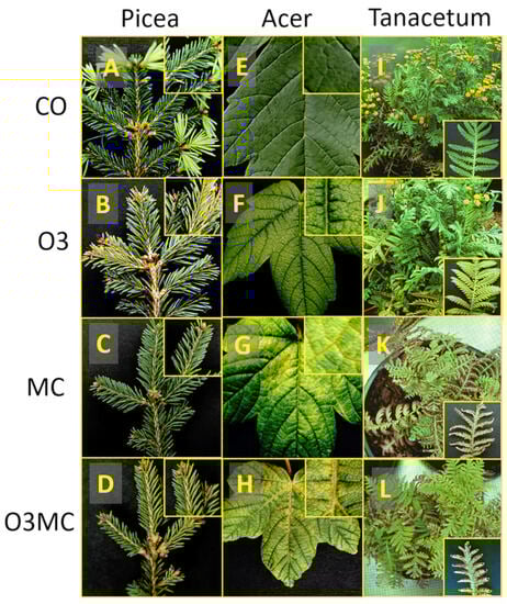 Figure 1. Exemplary visible symptoms in response to elevated ozone (O3, AOT40 = 35 ppm·h), metal contamination (MC), and the combination of the two treatments (O3MC) vs. control treatment (CO), as observed in foliage of Picea abies (AD), Acer pseudoplatanus (EH), and Tanacetum vulgare (IL) by the end of the first year of the experiment (100 days after flushing). Second flush needles in Picea were observed in the control treatment only. Flowering of Tanacetum was reduced by elevated ozone and prevented by metal contamination.