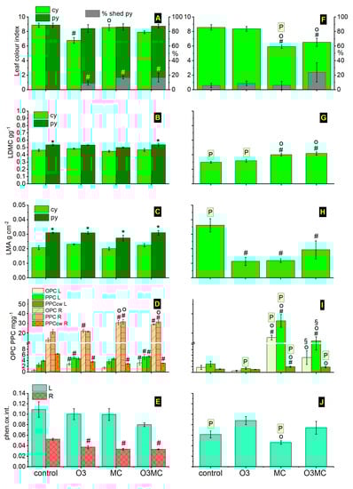 Figure 2. Changes in foliar (AJ) and fine root (D,E) traits of Picea abies (AE) and Acer pseudoplatanus (FJ) in response to elevated ozone (O3: AOT40 = 35 ppm·h), metal contamination (MC), and the combination of the two treatments (O3MC) vs. control treatment (CO), as observed by the end of the first year of experiment (100 days after flushing); mean values ± SE, n = 5 plants. The condensed tannin fractions are expressed as (+) catechin (OPC) and pelargonidin (PPC, PPCcw) equivalents. Abbreviations: current-year (cy) and preceding-year (py) needle generations; leaf dry matter content (LDMC) and leaf mass per area (LMA); oligoproanthocyanidins (OPC), cellular polymerised proanthocyanidins (PPC), polymerised proanthocyanidins within cell walls (PPCcw), phenolic oxidation intensity (phen. ox. int.), L = leaves, R = fine roots. Significance (p < 0.05 pairwise Tukey’s studentised range test comparisons): significantly different from control (#), O3 (o) and MC (§) treatment, from Picea same treatment (framed P), and from current-year needle generation (*). See Table A2 for the significance of the experimental factors.