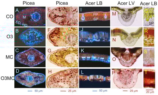 Figure 3. Histochemical changes underlying visible injuries in foliage tissues of Picea abies (AH) and Acer pseudoplatanus (IT) in response to elevated ozone (O3), metal contamination (MC), and the combination of the two treatments (O3MC) vs. control treatment (CO). (BD,JL vs. A,I): degradation of chlorophylls (reddish) and accumulation of polyphenolics (bluish) in cell walls of outer epidermal (ED) and hypodermal (HD) needle tissues and vacuoles within mesophyll (M), palisade (PP), and spongy (SP) parenchyma. Metal contamination caused more phenolic accumulation in cell walls, especially in outer needle and lower leaf blade tissues (C,D,K vs. A,I). (FH,NP,RT) vs. (E,M,Q): accumulation of proanthocyanidin oligomers (OPC, reddish) in vacuoles of needle mesophyll and leaf blade (LB) and leaf vein (LV) tissues. OPCs accumulated in palisade parenchyma with ozone stress but in lower leaf blade and vein tissues with metal contamination (accumulation in both locations in the combination treatment). Technical specifications: unfixed fresh sections visualised under UV-light excitation (AD,IL) or with bright field microscopy (EH,MT) after OPC revelation using the vanillin acid test.