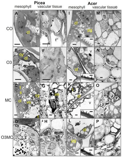 Figure 4. Degenerative changes in the cell structure of mesophyll and vascular tissues underlying visible injuries in foliage of Picea abies and Acer pseudoplatanus in response to elevated ozone (O3 treatment), metal contamination (MC treatment), and the combination of the two treatments (O3MC) vs. control treatment (CO; A,E,I,M). In response to the O3 treatment, the cell cytoplasm (cy) and chloroplasts (cl) showed increased condensation (B,J vs. control A,I), while the vascular tissues remained asymptomatic (F,N). The MC and O3MC treatments showed stronger injuries (C,K,D,L), with additional leakage of cell debris into the intercellular space (im), cytoplasm vesiculation (vs), accumulation of tannins (t, black) in the vacuole (v), apparent increase in size and frequency of plastoglobules (pg; Acer), or thylakoid swelling (ts; Picea). Within the phloem, plasmolysis (pl) and cytorrhysis (cr) suggested necrosis (G,O,H,P). In Acer leaf blades, the outer cell wall and cuticular ridges of epidermal cells (inset J,K,L) showed inlays of what is probably phenolic material, according to biochemical and histochemical evidence (Figure 2I and Figure 3K). Technical specifications: postfixation using OsO4, contrasting using uranyl acetate and lead citrate, observation in transmission electron microscopy (TEM). Bars = 2 µm.